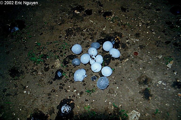 Discussion: Brief discussion since I'm writing this months later. Things paid off as we got a very nice long-lived supercell in central Kansas. Dave Fick and I targeted an area just N and NW of ICT. Storms developed rather weak and remained so until finally a storm got its act together near Newton, KS I believe (writing this Jan 2003). It was pretty high based but still a decent classic supercell with a wallcloud and tennis ball sized hail. We ran into THREE closed roads that day, one of them was our escape route of a small town as the sirens went off and we though a tornado looked quite possible. At the same time golf ball and tennis ball sized hail began to fall. With the sirens screaming, hail falling, and rotation almost overhead now, we decided to drive south of the closed road which paid off quite nicely. It was closed for about a mile or two and went back to asphalt. We took an east route and once again encountered another closed road, as our road dead ended. We stopped there since we were in a safe position and enjoyed the tennis ball sized hail falling. Several yards away a small pin with cows were getting pelted, however, the hail didn't' last long and we went outside to gather it up to measure it. Images of the hail are below.