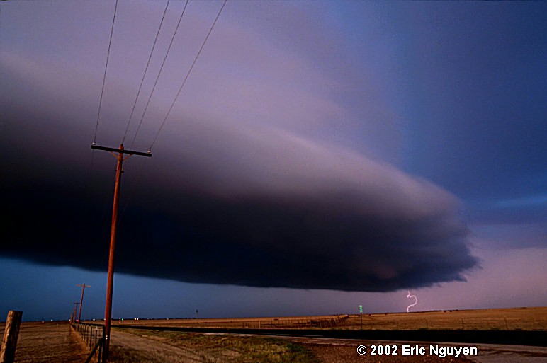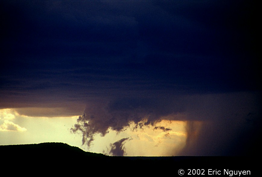 Discussion: I left class that morning and raced west on I-40 towards New Mexico to get a chase in before the bigger day on the 15th. I drove to the New Mexico / Texas border and took the only road going north, Hwy 39. I met up with a supercell near Mosquero, NM which had some decent structure and some scud / wallcloud development early on. It had a nice rain core and plenty of dime to quarter sized hail which blanketed Hwy 39 towards Roy, NM. Despite radar indicated rotation in the storm, I left it once the structure went down hill. I drove north towards another supercell located north of Roy, NM. I was stopped by an officer who warned me about others having significant problems with deer and other animals being hit toward night fall, which resulted in damage to their vehicles. I certainly hoped no animals were near this storm near Roy which was already a damaging storm. I stopped about 2-3 miles south of Roy, NM and took a few stills of this incredible HP storm! I was approached by a family in two vehicles looking for an escape route from the storm. I told them this road was pretty much it and if they went south they may elude it, however, the storm was moving due south as well. They were heading north and wanted to follow me into the core, so I let them. :-) I probably went 1 mile and was slammed by 65-70 mph recorded winds with a 78mph wind gust, and heavy quarter sized hail. I reported the severity of the storm to 911 dispatch, which was relayed to the ABQ NWS. Despite the report being relayed, severe thunderstorm warnings continued to have only ambiguous criteria for warnings on that storm and throughout the day. i.e., "large hail and high winds possible." It was certainly a classic high plains HP with lots of wind and hail. Luckily the hail sized was small enough that only minor dents probably resulted. I continued north towards Trinidad, CO to meet up with Jason Poliette for the next days storms.