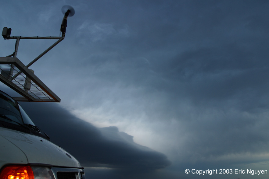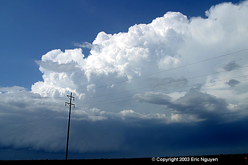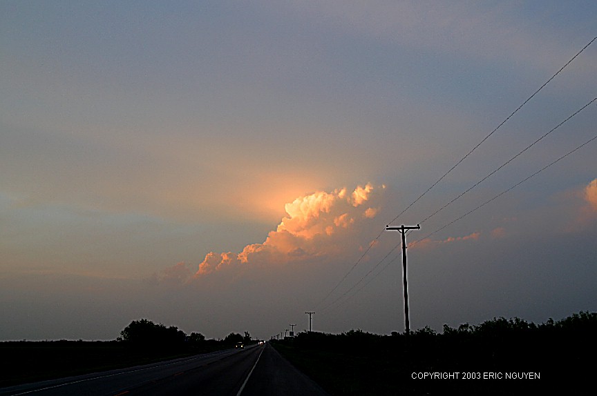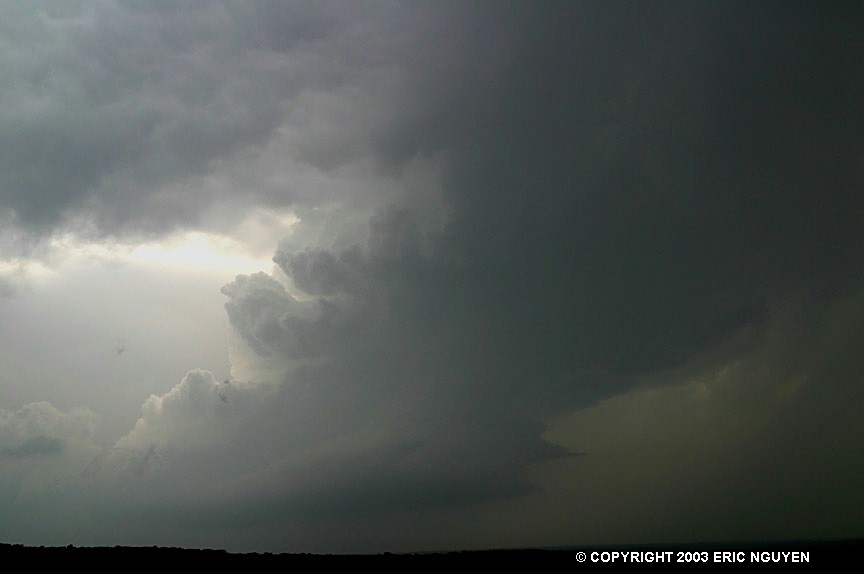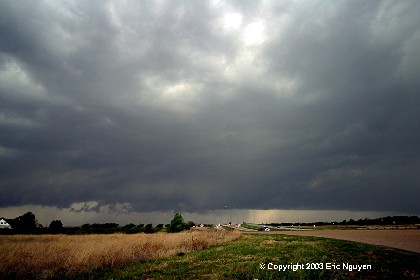 E TX PAN / W OK | TARGETED JUST NORTH OF SHAMROCK, TX. INITIAL STORM FORMED SW OF SHAMROCK MOVING NE AT 50MPH. I DROVE NORTH TO KELLERVILLE, TX AS THE STORM BEGAN TO LOOK MORE INTERESTING, HOWEVER, HP IN THE STRUCTURE THAT I COULD SEE. DUE TO THE FAST MOVEMENT OF THE STORM AND THE STRONG OUTFLOW ABOUT TO OVERTAKE ME AT KELLERVILLE, I OPTED TO MOVE SOUTH IN HOPES FOR ANOTHER STORM. INSTEAD, IT PRODUCED A TORNADO NEAR CHEYENNE. SO ANOTHER TORNADO MISS, HOWEVER, A DIFFICULT CHASE WITH NO STRUCTURE, FAST STORM MOTION, AND EMBEDDED RAIN. THE INTERESTING THING I OBSERVED WAS THE VERY INTENSE INFLOW, WITH GUSTS NEAR 50MPH IN THE INFLOW OF THE KELLERVILLE STORM. IMAGE OF LINEAR UPDRAFT THAT WENT NORTHEAST TOWARD KELLERVILLE. | |