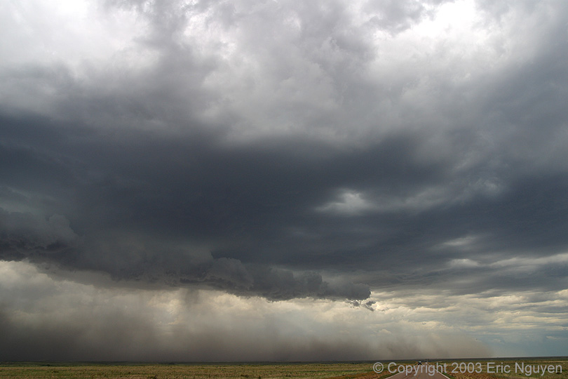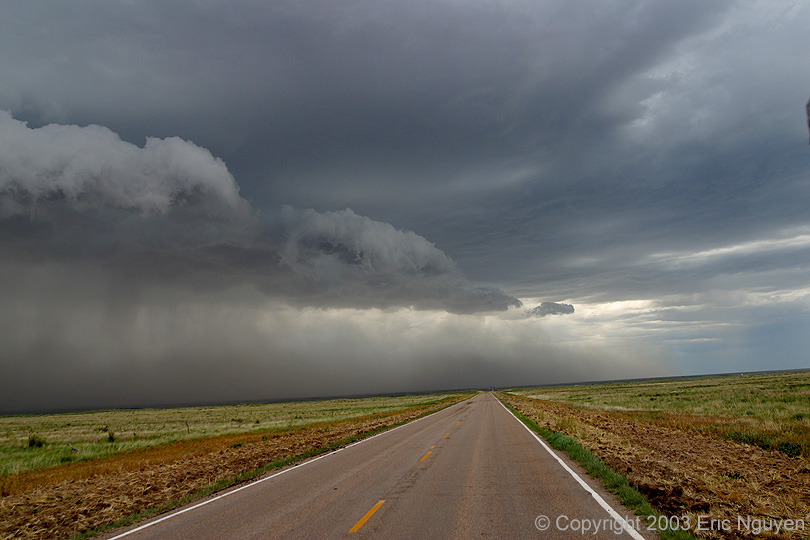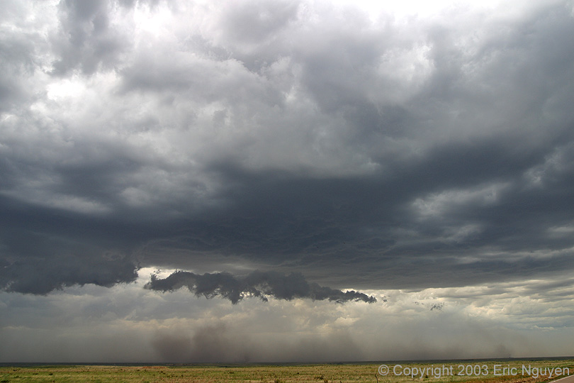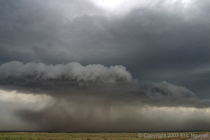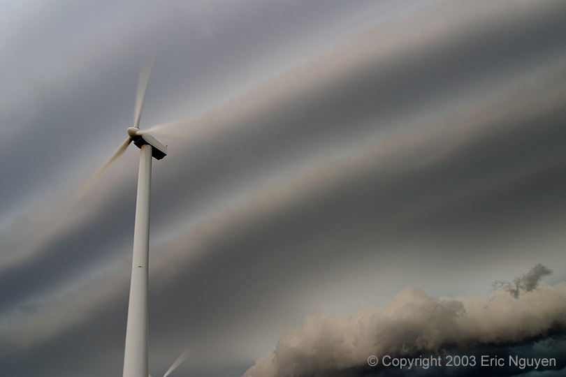 Discussion: Jeff Lawson, Scott Blair, and I observed a gorgeous shelf cloud in SW Kansas. We observed storms developing near the town of Johnson, Kansas, which quickly became outflow dominant and morphed into a shelf cloud. We stopped near Sublette, Kansas, to watch the huge wind power generators.