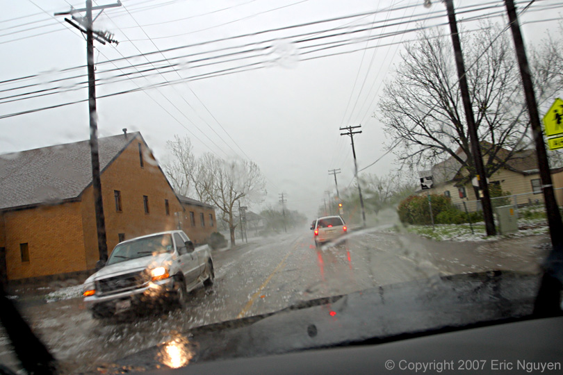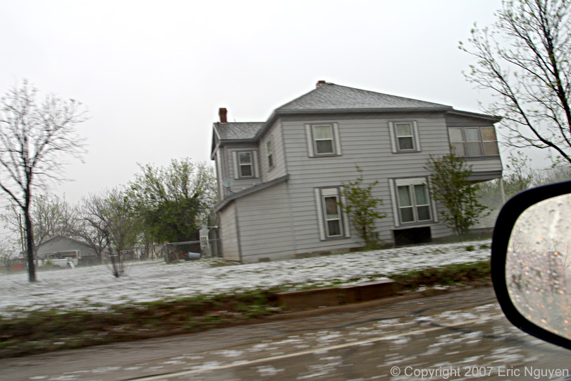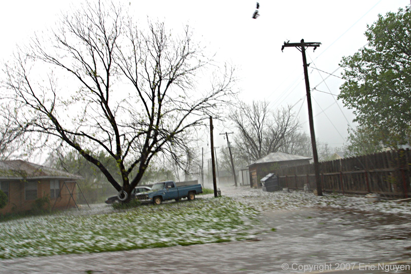 large swath of baseball hail that covered much of the city as well as street flooding.
